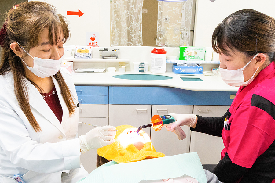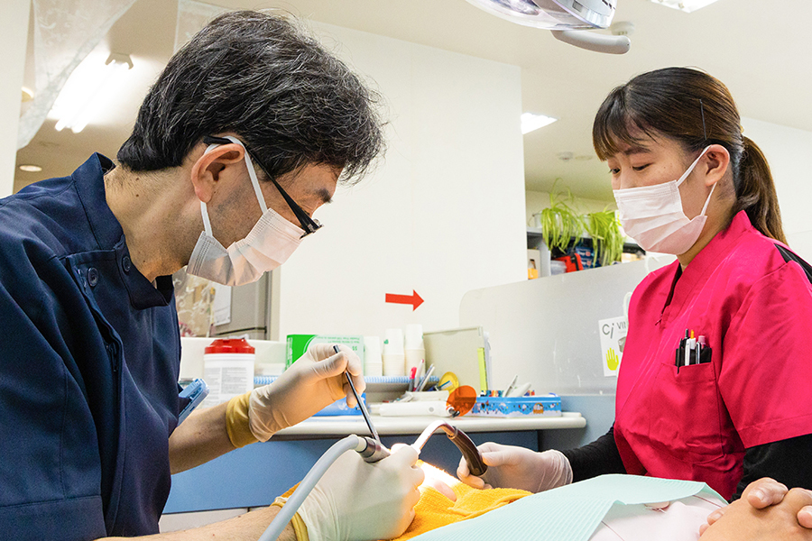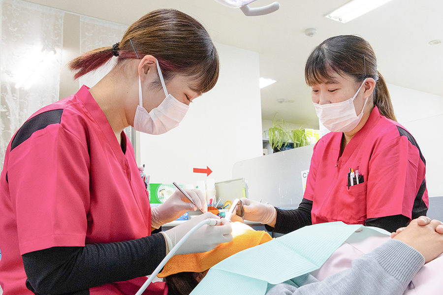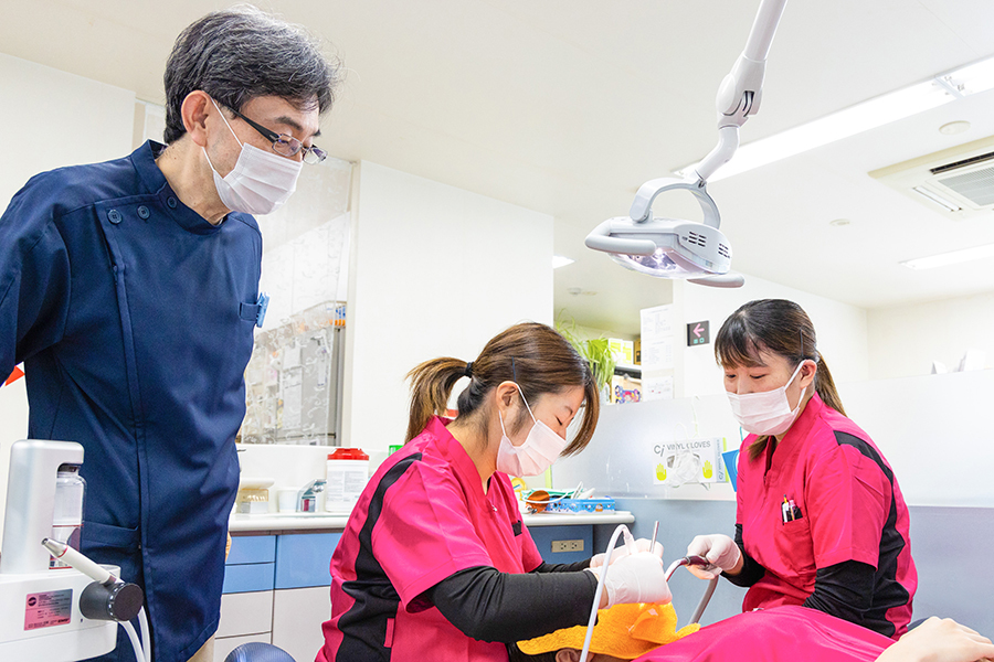 歯科医師、歯科衛生士、歯科助手、受付がそれぞれの持ち場と仕事に専念しますが、診療はスタッフ皆で助け合いながら行っています。患者さまのために、スタッフ全員が真剣に治療をするよう取り組んでいます。